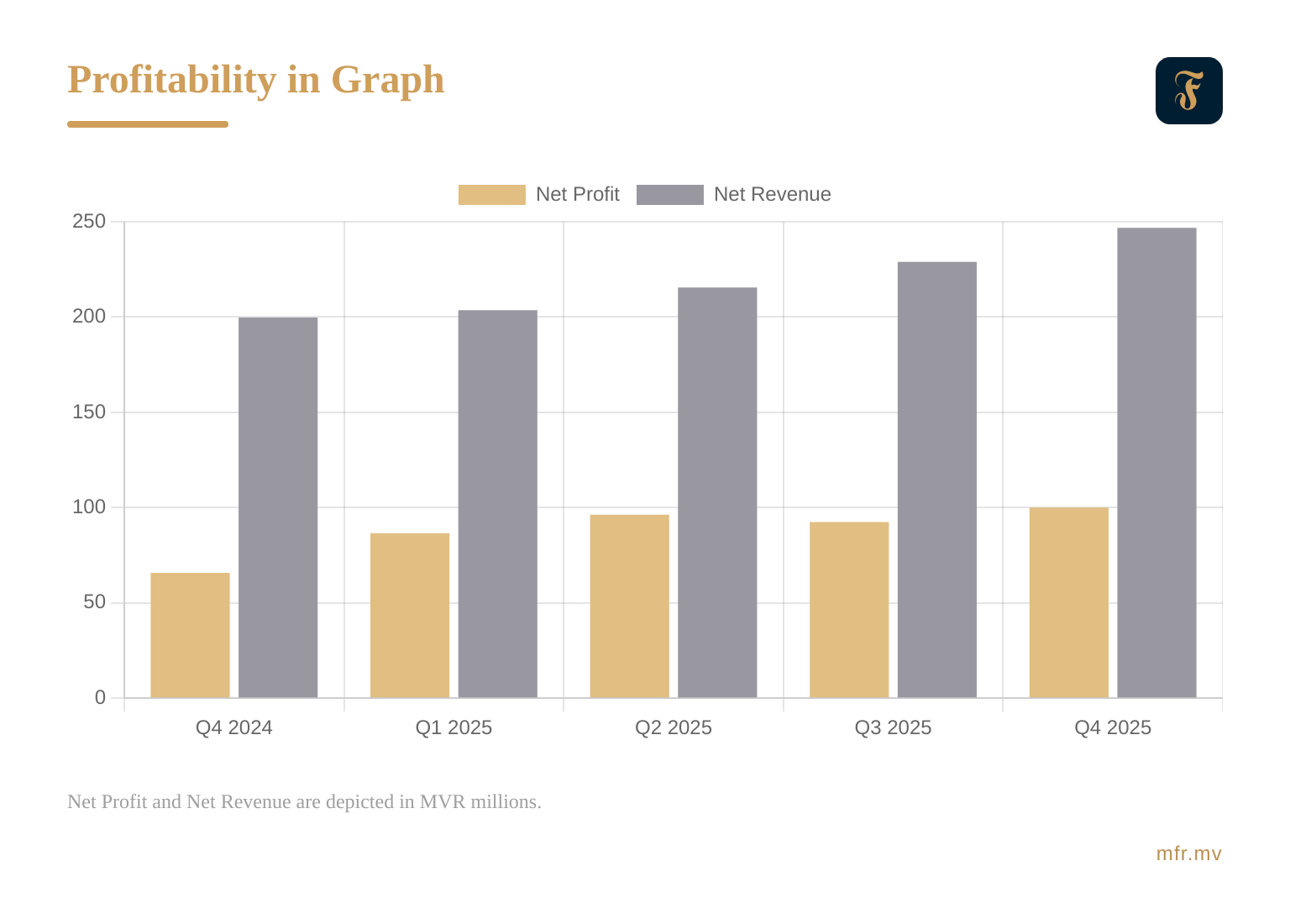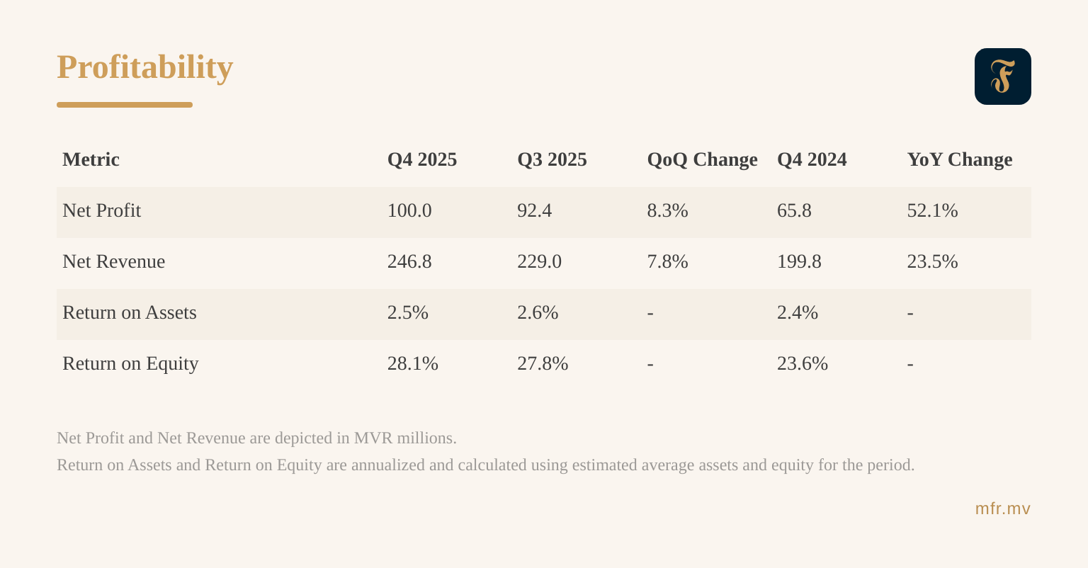 Profitability strengthened further in the fourth quarter as revenue growth continued to support earnings expansion. Total revenue rose to MVR 246.8 million, increasing 7.8% from the previous quarter and 23.5% year-on-year, reflecting growth in financing activity and fee-based income. Net profit for the quarter reached MVR 100.0 million, up 8.3% quarter-on-quarter and 52.1% compared to Q4 2024, bringing total profit for 2025 to MVR 375.4 million. Profitability ratios remained healthy despite rapid balance sheet expansion, with return on assets at 2.5% and return on equity improving to 28.1%, indicating that profitability remained resilient even as the Bank expanded its balance sheet at a rapid pace.