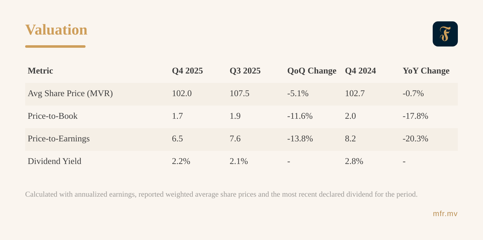 Valuation multiples declined during the quarter as strong earnings growth was not matched by movements in the Bank’s share price. While profitability expanded significantly during the year, the average share price remained broadly stable at MVR 102.0, down 5.1% from the previous quarter and slightly below MVR 102.7 in Q4 2024. As a result, valuation metrics compressed materially, with the price-to-earnings ratio falling to 6.5 from 7.6 in Q3 2025 and 8.2 a year earlier, while the price-to-book ratio declined to 1.7 from 1.9 in the previous quarter and 2.0 in Q4 2024. Despite the lower multiples, the Bank continues to generate strong shareholder returns, with ROE at 28.1%, implying that the current valuation appears relatively modest compared with the Bank’s underlying profitability.