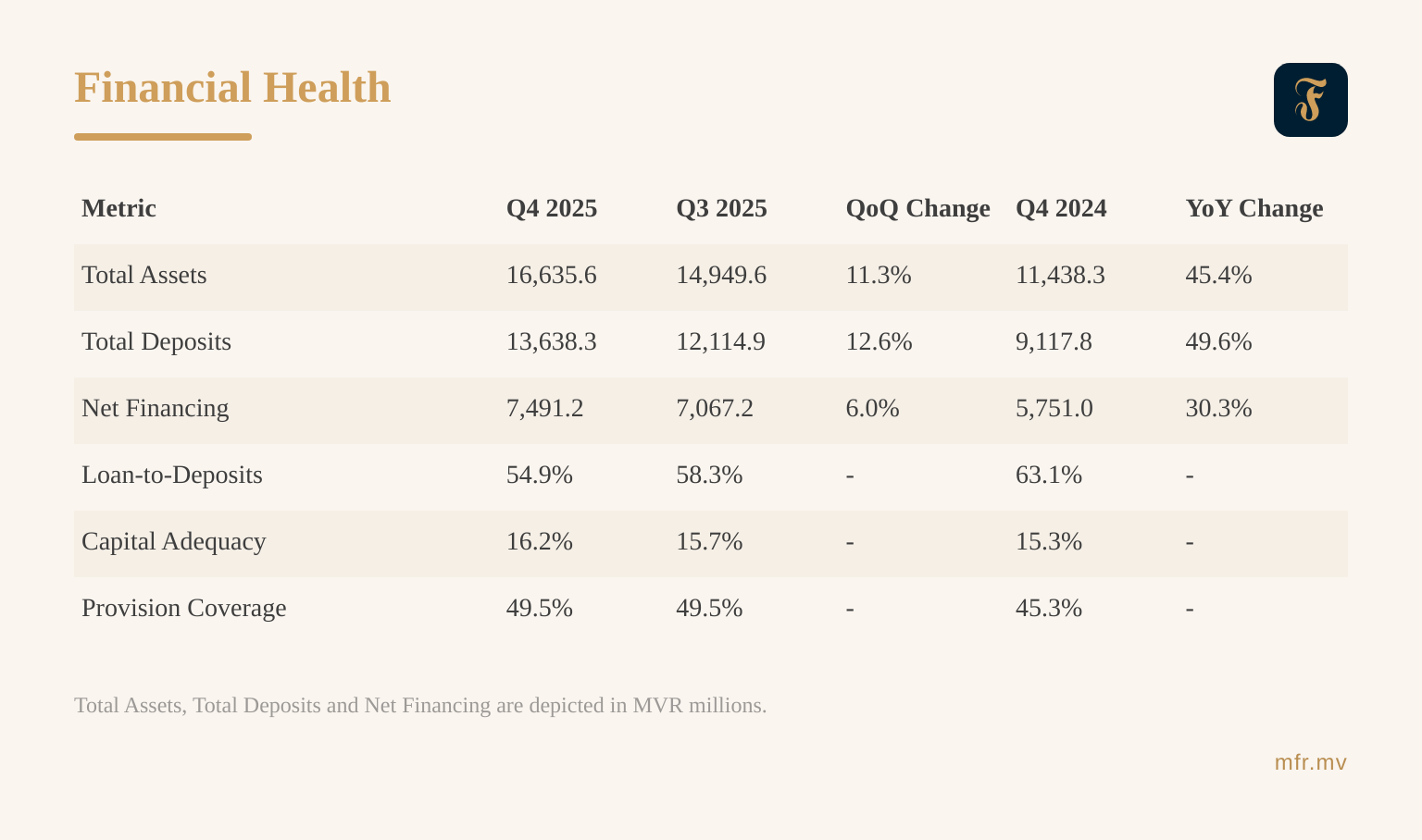 This report is based on publicly available information from Maldives Islamic Bank PLC and the Maldives Monetary Authority; certain metrics presented may differ from published figures due to variations in calculation methodology.