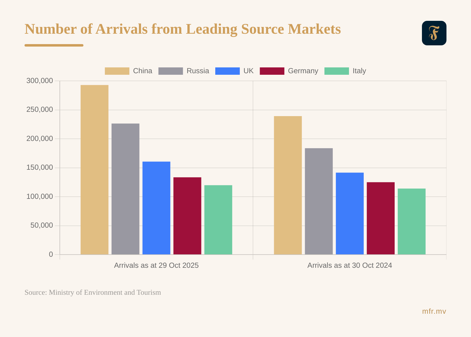 As of 29 October 2025, China remained the largest source market, representing a market share of 16.1 percent. Russia followed with 226,363 arrivals, capturing 12.5 percent of total arrivals compared to 10.9 percent in 2024. Among European markets, the United Kingdom recorded 160,693 arrivals (8.8 percent share), Germany 133,460 arrivals (7.3 percent), and Italy 119,859 arrivals (6.6 percent). Overall, the top five source markets accounted for 51.3 percent of total tourist arrivals, highlighting the continued reliance on key Asian and European markets while also reflecting steady year-on-year growth across major contributors.