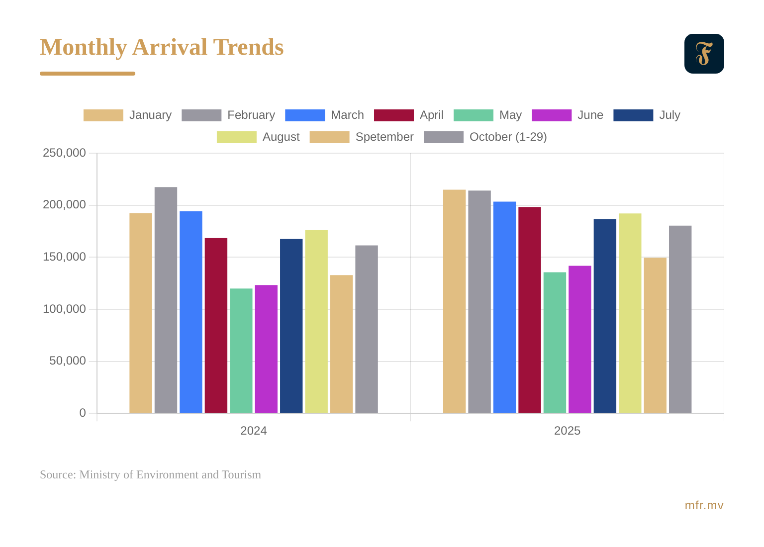 Monthly arrivals exceeded 200,000 during the first quarter, and although the second quarter reflected typical seasonal moderation, performance still surpassed previous years. According to the statistics published by Maldives Bureau of Statistics, the gross value added (GVA) of accommodation and food services grew by 13.7 percent in the second quarter of this year compared to the corresponding quarter of last year, with the increase in number of tourist bed-nights. The July-October period maintained solid momentum, averaging around 177,000 visitors per month. Industry performance is expected to remain strong and comparatively higher in the final quarter of the year.