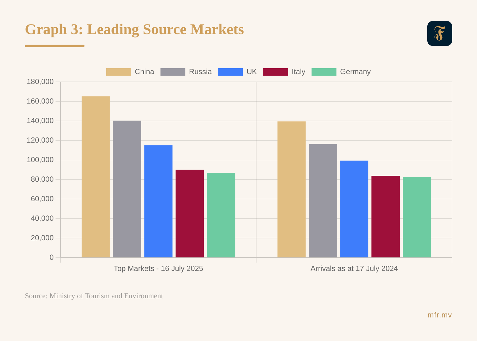 As of 16 July 2025, China, Russia, the UK, Italy, and Germany remained the top five source markets, consistent with July 2024. While these markets account for 49.7 percent of the total tourist arrivals, slightly higher than 47.3 percent reported on 18 July 2024, their sustained dominance, led by China with 165,134 arrivals in July this year, reflects strong market stability and resilience despite global uncertainties. All five markets saw increased arrivals compared to the corresponding period of last year, highlighting the effectiveness of targeted marking efforts by relevant authorities and the strategic partnerships they have established in these regions.