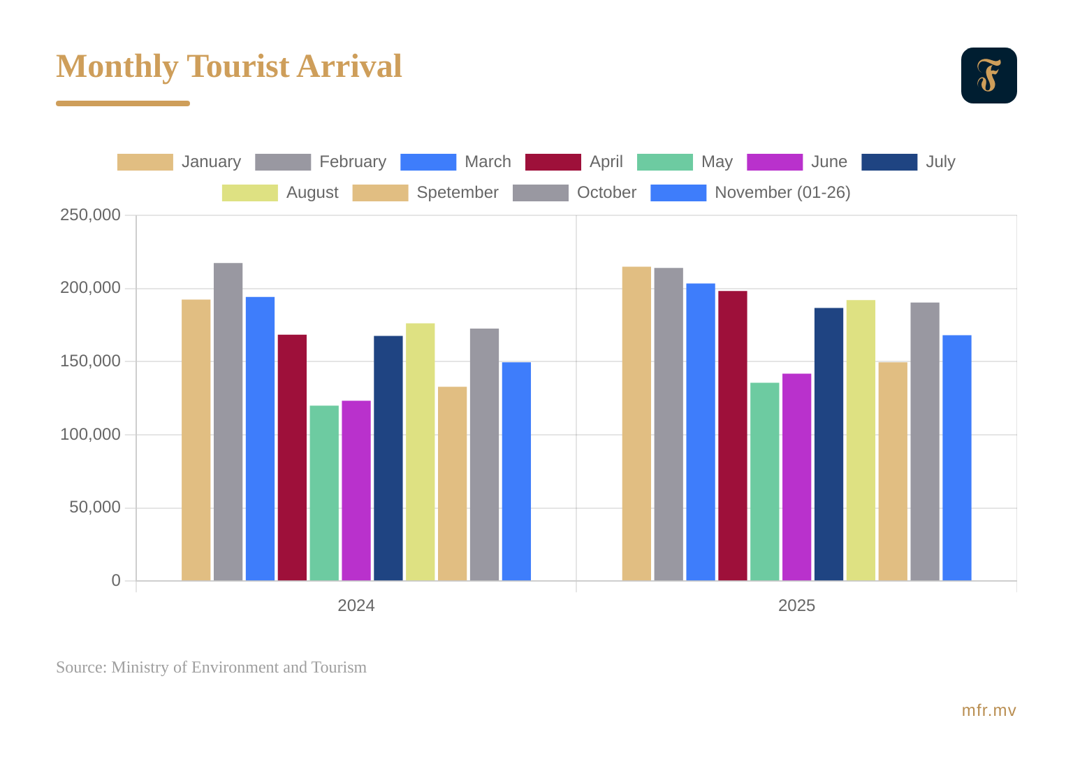 Maldives Tourism Updates, published by the Ministry of Tourism and Environment indicate that total tourist arrivals to the country has reached 2.0 million by 26 November 2025, reflecting an increase of 10.0 percent, compared with the corresponding period of last year. The industry celebrated the arrival of two-millionth tourist on 27 November 2025. As of the publication date, total arrivals for November stood at 167,990, a 12.4 percent increase compared with the same period last year. Consequently, the daily average number of tourist arrivals for the month of November is at 6,461.