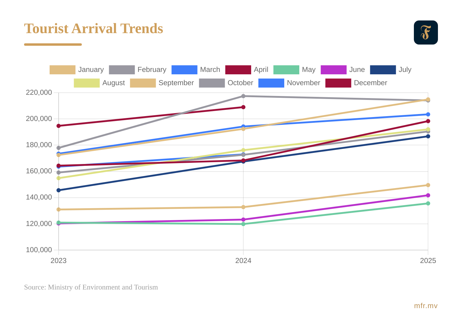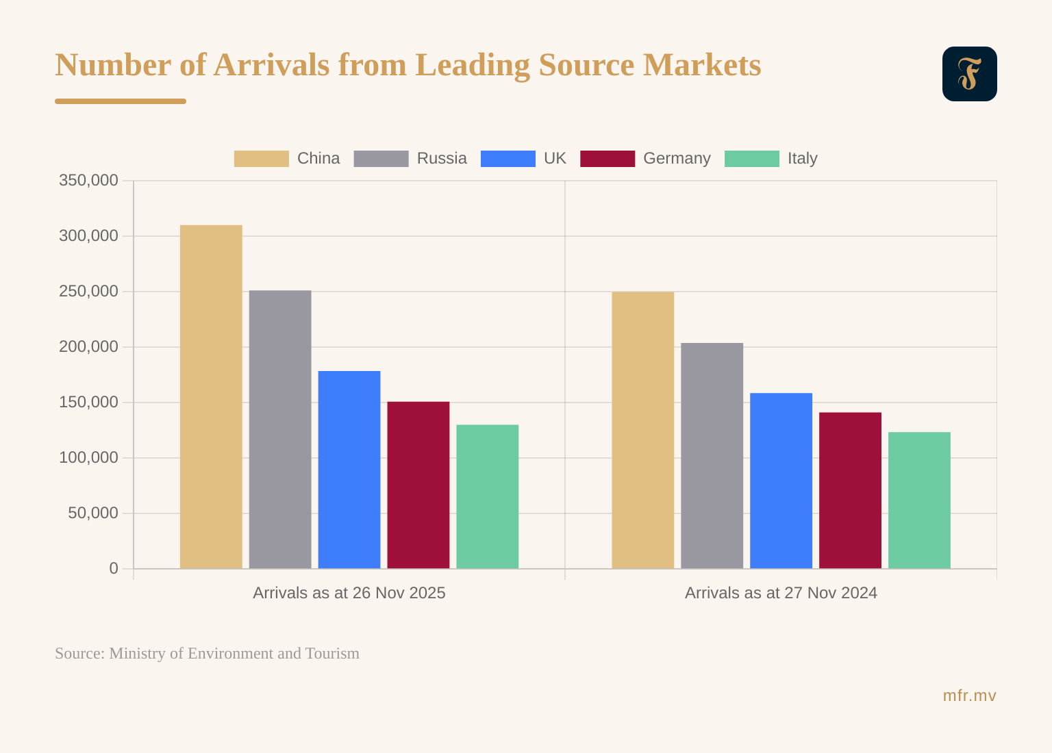 While total arrivals continue to exceed the performance of previous years, the Ministry of Finance and Planning states in Government Budget 2026 publications that tourist arrivals will reach 2.4 million next year, reflecting an increase of 8.8 percent compared with the target for this year. The Ministry highlighted that the full-year impact of the Velana International Airport expansion and upgrades to Hanimaadhoo International Airport is expected be realized next year. The Ministry further expects the year on year growth rate of tourist arrivals to stabilize at 7.7 percent over the medium term.